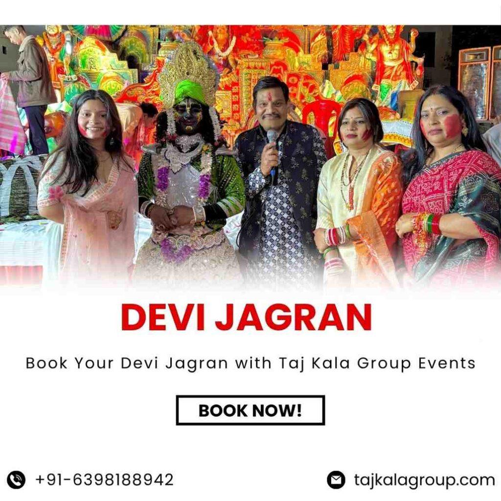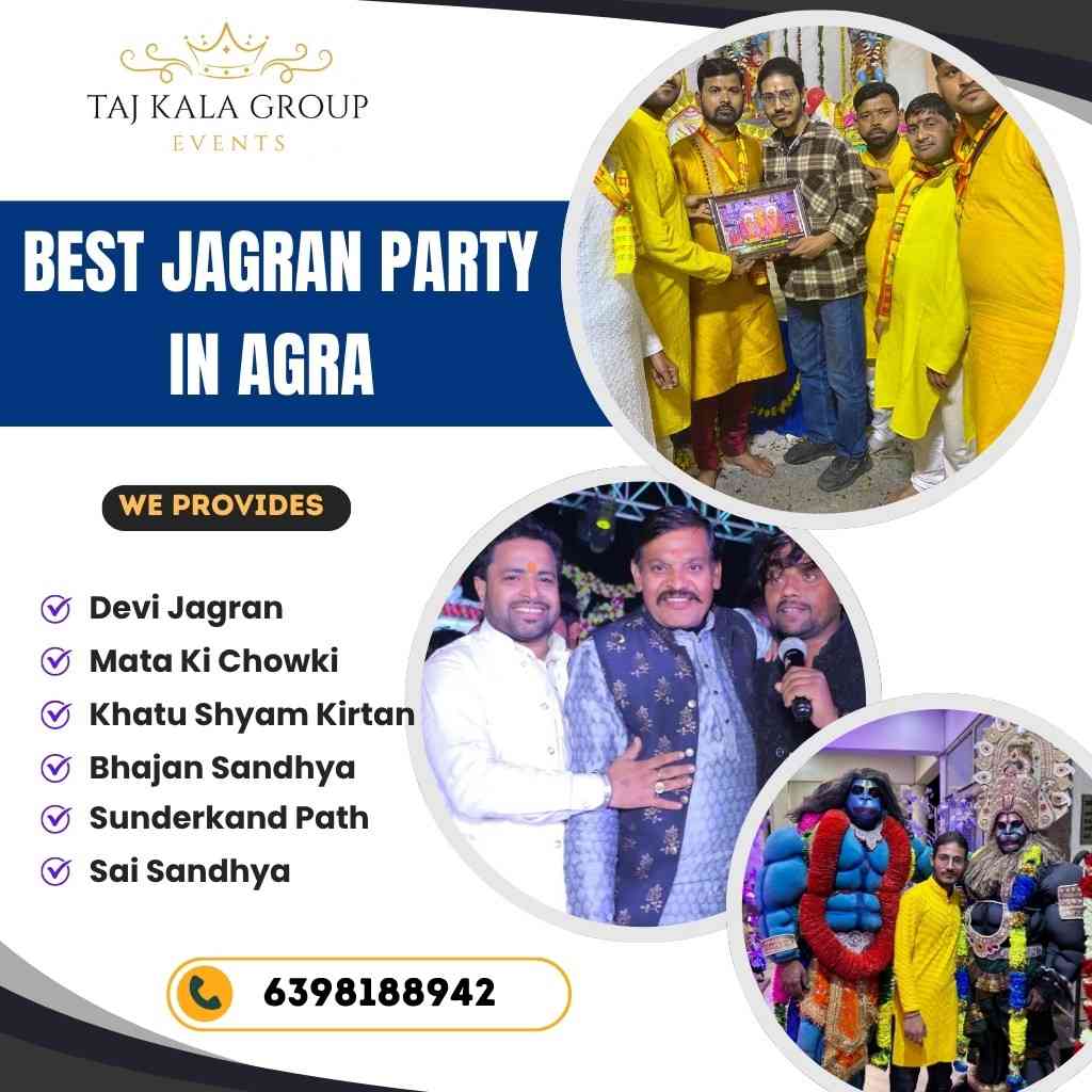 At Taj Kala Group Events, we are the best Jagran party in Agra and a trusted event planner for Devi Jagran. Our team, recognized as a creative Jhanki art group in Agra, organizes devotional programs such as Devi Jagran, Mata Ki Chowki, and Khatu Shyam Kirtan with soulful bhajan singers and professional stage setups. Known as a top Jagran party near me, we make every event vibrant, spiritual, and memorable. For bookings, contact us via our Jagran party contact number — your go-to event organiser for Devi Jagran in Agra.