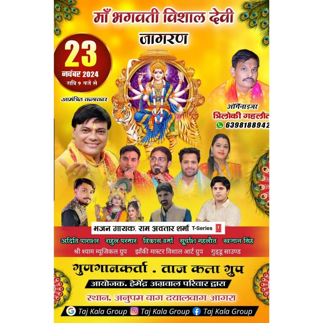 Explore our previous Devi Jagran programs organized by Taj Kala Group Events at various locations including Agra, Dayalbagh, Fatehabad, and nearby regions. As one of the best Jagran parties and event planners in Agra, we have successfully organized Vishal Devi Jagrans, Mata Ki Chowki, and devotional events featuring renowned T-Series singer Ramavtar Sharma and popular devotional singer Sandeep Mastana, along with Best Jhanki art Group.
