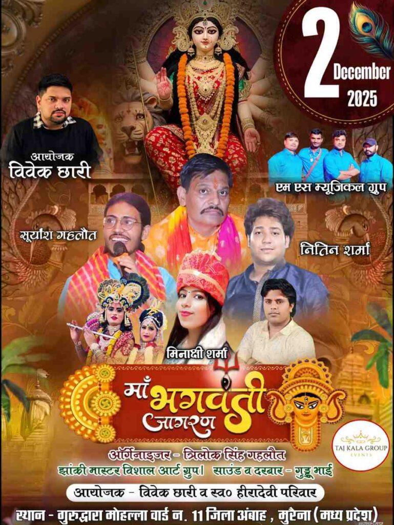 Taj Kala Group Events organized a grand Devi Jagran Party at Gurudwara Mohalla, Ambah (MP), at the residence of Vivek Chhari. The program was filled with devotion and positive energy, making it one of the best Jagran Party in Ambah. Devotees enjoyed a beautiful Mata Rani Ka Darbar setup with attractive stage decoration and powerful lighting effects.