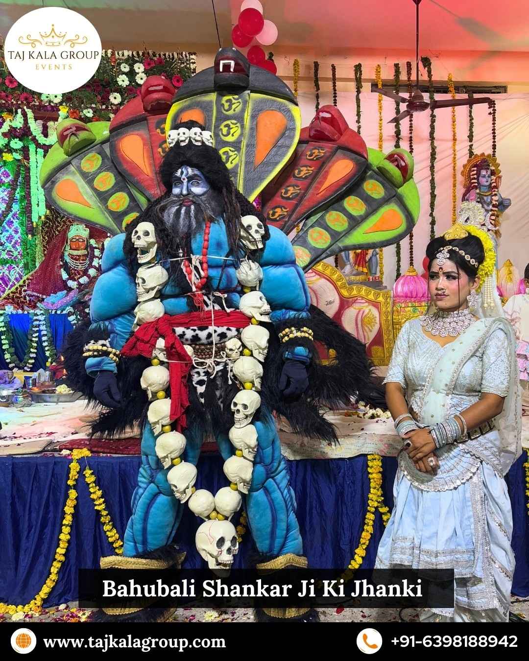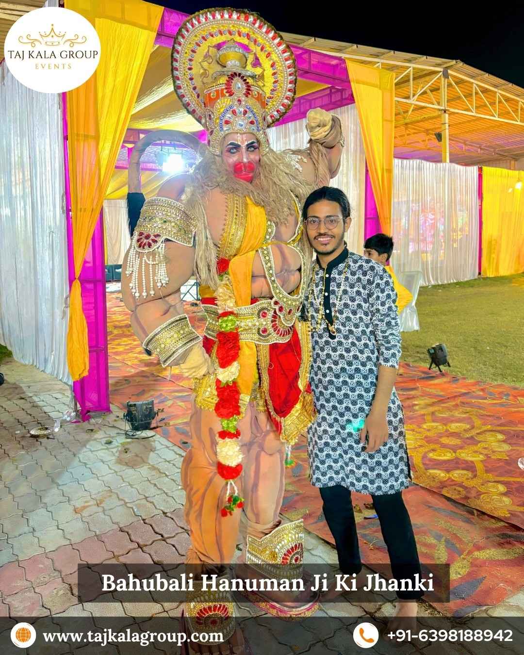 Taj Kala Group Events organizes an authentic Devi Jagran that traditionally starts at night around 10:00 PM and continues till 4–5 AM in the morning. The Jagran begins with soulful bhajan singing by professional bhajan singers, creating a devotional and energetic atmosphere. During the program, beautiful and powerful Jhanki presentations are performed in between bhajan sessions, including Radha Krishna Jhanki, Shankar Parvati Jhanki, Sherawali Mata, Kali Mata, and the crowd-favorite Bahubali Hanuman Ji Jhanki.